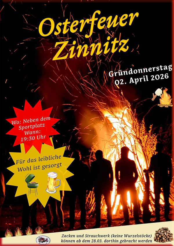 Außerdem finden Sie hier regelmäßig Informationen aus unserem Verein, der Freiwilligen Feuerwehr Zinnitz und aus unserem Ort.